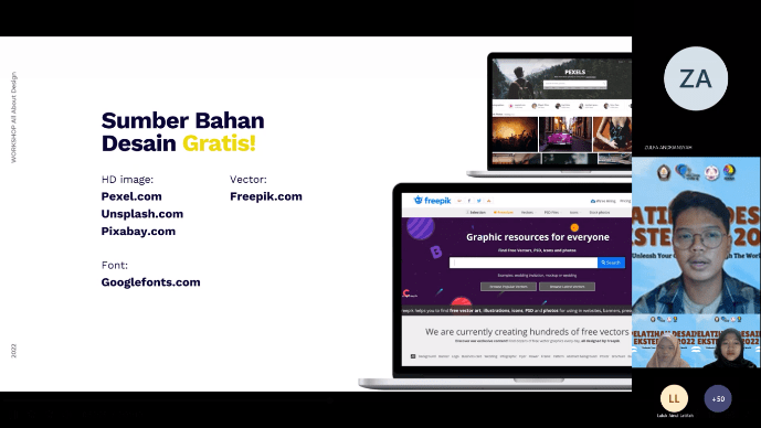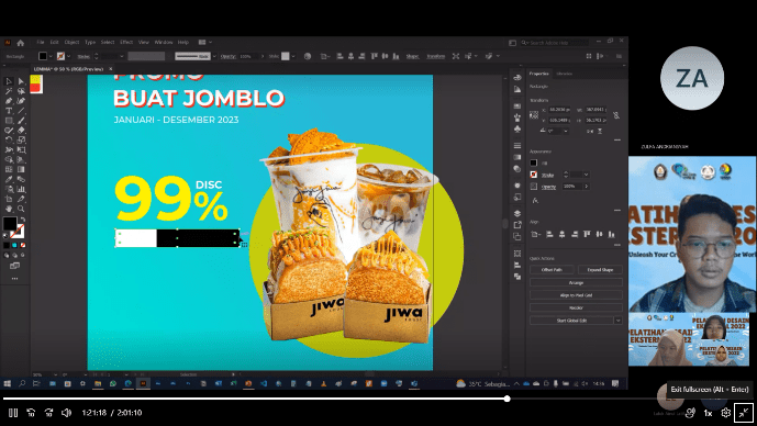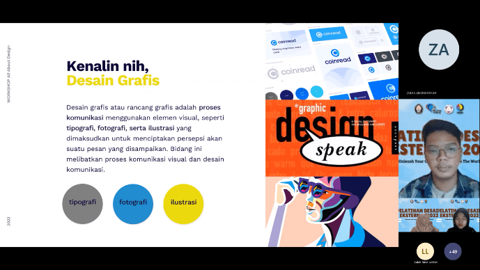 Selain itu, masih banyak lagi materi yang disampaikan, seperti seberapa penting desain grafis dalam dunia digital, rekomendasi sumber bahan desain, tips mencari inspirasi ide, dan sebagainya. Selanjutnya pada sesi kedua, narasumber melakukan demo yang di mulai dengan memperkenalkan panel aplikasi dan mempraktikkan pembuatan desain poster menggunakan Adobe Illustrator.