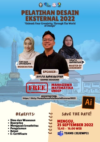 Biro LEMMA HM Matematika Universitas Diponegoro 2022 telah menyelenggarakan Pelatihan Desain Grafis Eksternal pada hari Minggu, 25 September 2022 secara daring melalui via Microsoft Teams dengan mengusung tema “Unleash Your Creativity, Through the World of Design”. Pelatihan ini merupakan wadah untuk meningkatkan kreativitas dan inovasi. Desain grafis yang menarik dapan memudahkan informasi tersampaikan lebih baik melalui visual.