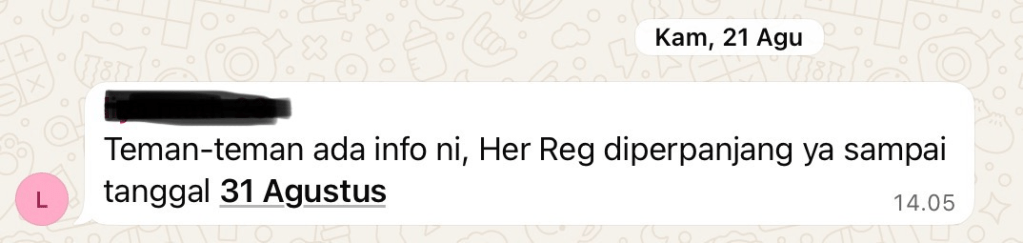 Nah, ini kabar yang bikin mahasiswa agak kaget. Her-Registrasi (Her-Reg) yang seharusnya udah selesai, ternyata diperpanjang sampai tanggal 31 Agustus. Padahal, kuliah udah mulai jalan sejak minggu lalu.